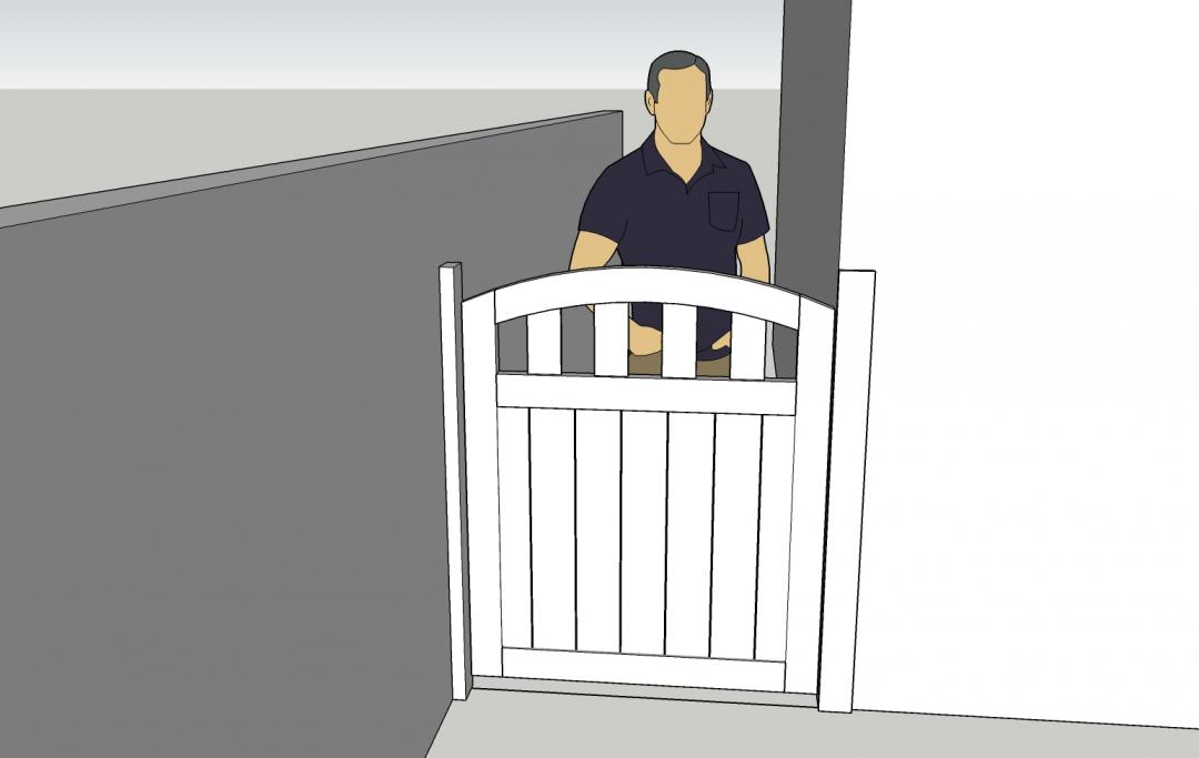 I decided to have the gate hinge from the wall rather than the house, and swing out into the backyard. I also decided to have two catches for the latch so it could be held open as well as closed.